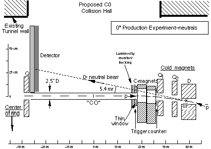 In principle the experiment could be set up at any long straight section. However, because of the new collision hall planned for C0, it is the logical choice. The possibility of clearing out material near the beam exists at C0, and the infrastructure necessary to support the experiment will be available there. If the experiment is installed at C0, it is assumed that the C-magnets and Lambertsons now located there would be removed or relocated. Most of this work would be required for the BTeV detector expected to be installed there in any case. Our main requirement is a clear path for the particles. We also need a "thin" window such as that shown in Figs. 2-4; this can be =2 mm thick since the particles are incident near 90°.