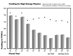 The chart, which appears at right, shows a $180 million decline in annual funding for operations and equipment for high-energy physics at DOE from 1990 until the present year, using current-year dollars and totals supplied by DOE's Division of High-Energy Physics. These are the funds required to utilize the investment in physics facilities. Fermilab's Witherell explained that the inflation index used to calculate yearly levels almost certainly underestimates the real inflation rate that high-tech organizations have typically faced in recent years. The "Operations and Equipment" line results from subtracting construction funds, including funding for the U.S. contribution to the Large Hadron Collider at CERN, from the total. The low level of construction funding in the years 1990-1993 occurred because the construction funding for the Superconducting Super Collider laboratory, now terminated, is not included in the total.