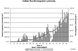 During the second week of October, beam experts achieved an all-time Tevatron record of 6.7 inverse picobarns in a single week, more than a factor four larger than the weekly integrated luminosity twelve months ago. They also set several all-time records for the highest peak luminosity,with a current top value of 3.7 x 10-5 inverse picobarns per second. “Over the past year, we’ve investigated over fifty ideas to improve the Tevatron performance,” said Vladimir Shiltsev, the head of the Tevatron Department.“Five attempts were really successful, resulting in major improvements. Ten attempts were so-so, and the others didn’t fly. It is a continuous search.” During 2002, scientists and engineers have carefully studied and adjusted subsets of the 66,000 accelerator parameters to increase beam luminosity, improving the rate of collisions. In March, a graphic published in FERMINEWS explained the troubles beam experts had identified at that time (FERMINEWS ,March 1,2002,Vol.25, No.4). The updated version (see graphic on page 4) shows that scientists have corrected many of them. “At the beginning of the year, we still had large problems with transfer efficiencies, getting particles from their point of production through several stages of acceleration into the Tevatron,” Shiltsev said.“These problems have largely been resolved.” Fermilab’s antiprotons, for example, travel through three different accelerators before arriving at the Tevatron. Each transfer from one accelerator to another is comparable to transferring water from a container into an empty bottle using a garden hose. If the diameter of the hose is larger than the opening of the bottle,a lot of water will be spilled, resulting in low transfer efficiency. Repeating the inefficient transfer process several times,pouring the water from one bottle into the next, the losses quickly add up. If the bottles have leaks, the total efficiency drops even more. Handling antiprotons, arguably the most precious particles on earth, scientists try to minimize losses as much as possible. “In March, we saw a total efficiency of 30 percent in getting particles to the collision point,” said the deputy head of the Beams Division, Mike Church, recalling the problematic performance of the accelerator complex at the beginning of the year. “Now we are at 70 percent, which is better than during Run I. Our goal is 80 percent.”