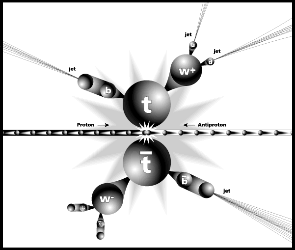 In this artist's representation of a particle collision, a proton and antiproton collide at nearly the speed of light, producing a top quark and anitquark. Within a tiny fraction of a second, these two heavy, unstable particles decay into lighter particles. The decay chain can produce bursts of light particles that are observed as jets.