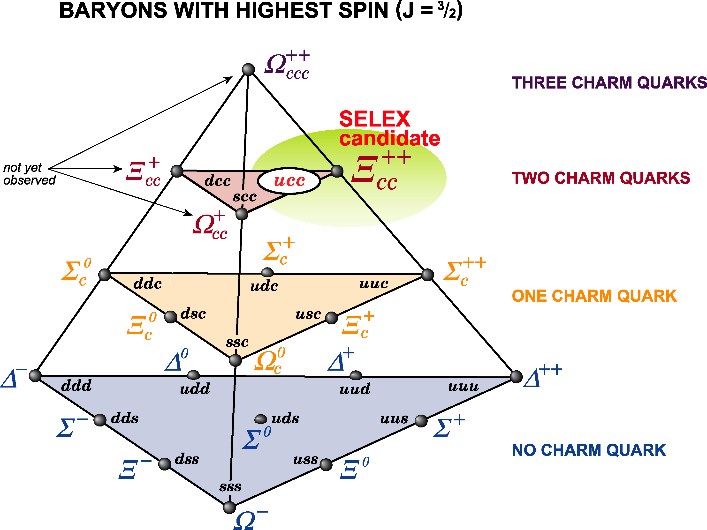 The four lightest quarks - up, down, strange and charm - can be arranged in 20 different ways to create baryons, composite particles containing three quarks. Some of the combinations come in two different spin states: an excited state (J=3/2) and a ground state (J=1/2). The SELEX experiment has found candidates for three previously unobserved baryons, all containing two charm quarks.