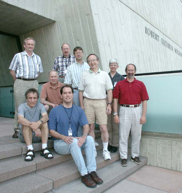 Some of the members of the SELEX collaboration in front of Fermilab's Wilson Hall. Standing from left: Nikolai Terentyev, Nikolai Kuropatkin (both St. Petersburg, Russia), Jürgen Engelfried (San Luis Potosi, Mexico), Jim Russ (Pittsburgh, Pennsylvania), Loretta Dauwe (Flint, Michigan) and Peter Cooper (Batavia, Illinois). Front row from left: Nikolai Bondar (St. Petersburg), Joe Lach (Batavia), Mark Mattson (Detroit, Michigan) |
