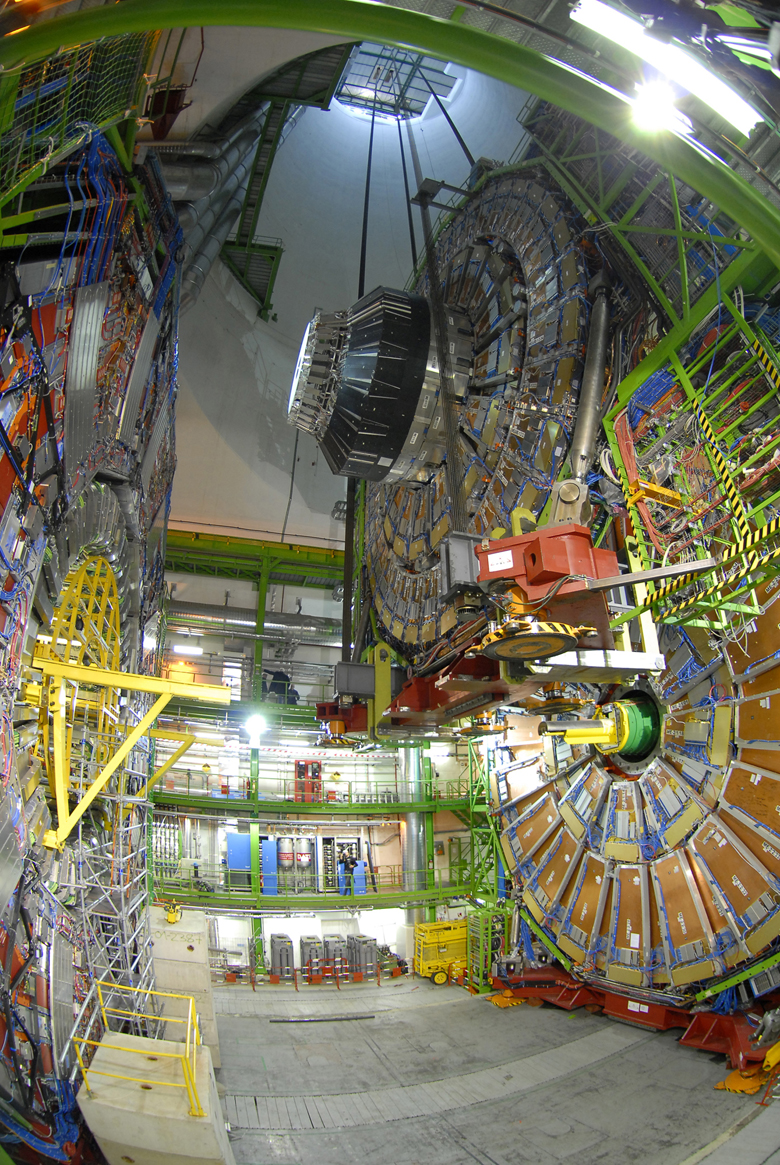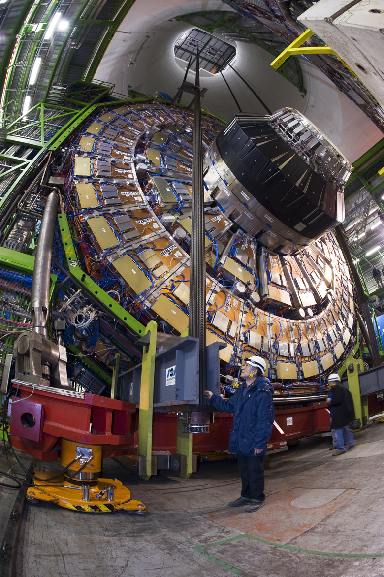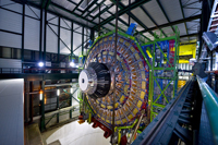 Click on links below images for medium and high-resolution jpeg images. When using these images, please credit each photo as indicated. Scientists first constructed and tested the CMS detector in an above-ground assembly building. Image courtesy of Michael Hoch, Adventure Art. This final piece weighs 1,430 tons and measures roughly 45 feet in diameter. Image courtesy of Michael Hoch, Adventure Art. CMS scientists position the final piece of the detector above the shaft and begin to lower it into the underground collision hall, 300 feet below. Image courtesy of CERN. Going down! Collaboration members watch the last piece of the detector go underground. Image courtesy of CERN. Touch down. Now that the final piece is underground, final commissioning will begin on the CMS detector. Image courtesy of CERN. Return to Press Release |